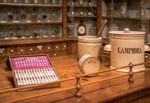 Архитектурная реставрация более старых аптечных построек, к сожалению, уже невозможна. Но аптечные заведения XVIII и XIX веков поддерживаются до сих пор. В XIX веке такие постройки украшались изнутри с художественным усердием. Здесь часто находились лабораторные помещения, где проходили химические работы. В водных погребах хранились целебные жидкости и спиртовые настойки. Важной частью аптечного здания также был чердак. Там сушили больничные цветы, корни, травы.